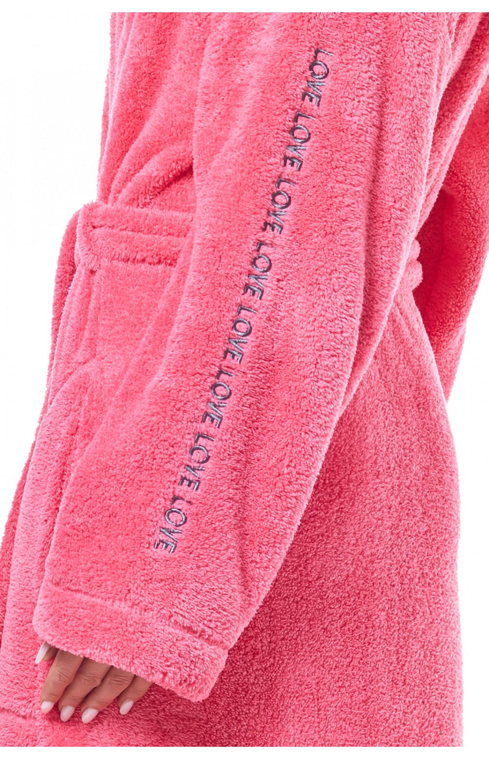 Ярко-розовый теплый женский халат L&L 9131 LV. Модель длиной до колена, с капюшоном. Удобные боковые карманы по линии шва. Выполнен из мягкой пушистой махры. Завязывается поясом. На длинных рукавах декоративные надписи "Love". Отличное качество от польского производителя.