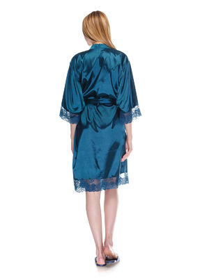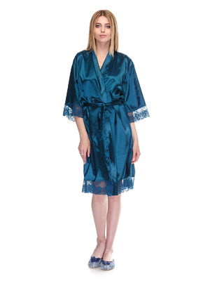 Великолепный атласный халат цвета морской волны от украинского производителя Serenade 2121. Изделие с широкими рукавами длиной до локтя, украшенными по краю красивым кружевом. По нижнему краю халатика также кружево. Гладкие полочки. Атласный пояс. Элегантный халат для роскошных образов.