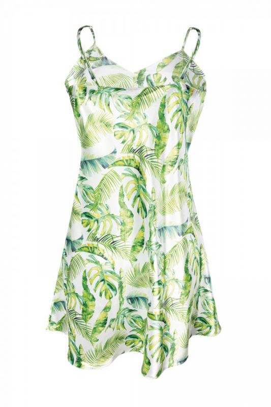 Чудесная ночная рубашка с тропическим принтом в зеленом цвете DKaren Flowers DK-HK. Модель лаконичного приталенного фасона. Тонкие регулируемые бретели, V-образный вырез. Изделие выполнено из гладкого, приятного к телу атласа.