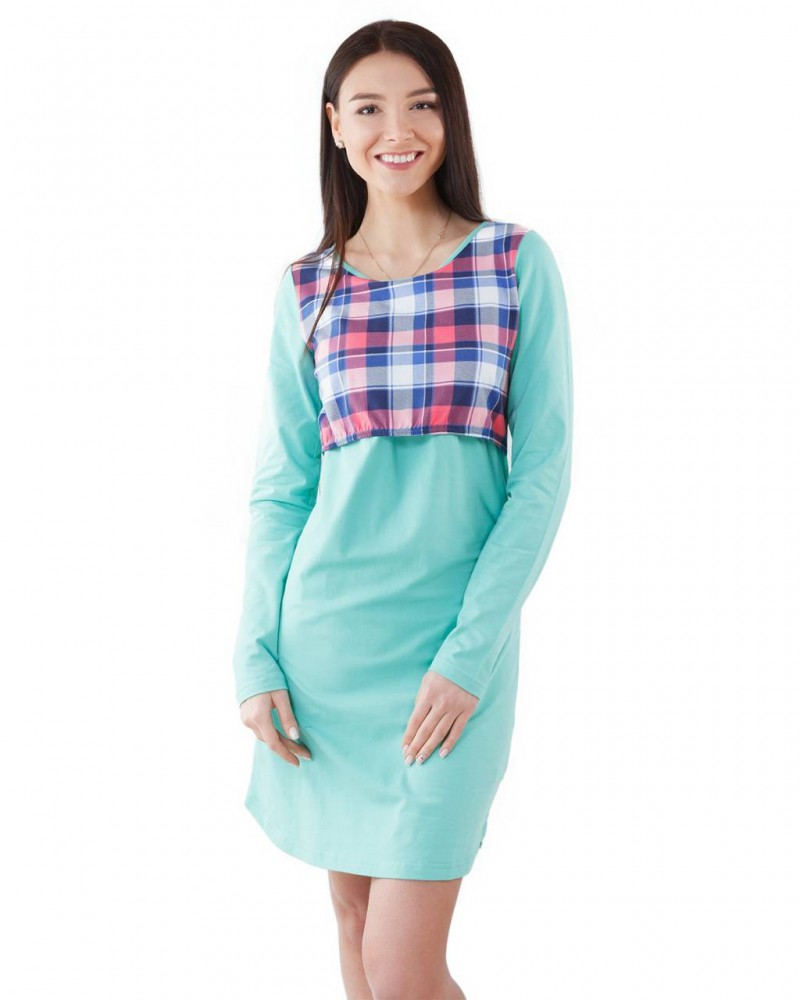 Оригинальная ночная рубашка для кормления NL 049. Выполнена из хлопкового трикотажа мятного цвета и красно-синей клетки. Сорочка с длинными рукавами, длиной чуть ниже середины бедра, неглубоким круглым вырезом. Вставка на груди внизу собирается резинкой, благодаря чему легко поднимается. Внутренняя часть имеет вырезы для груди для удобного кормления.