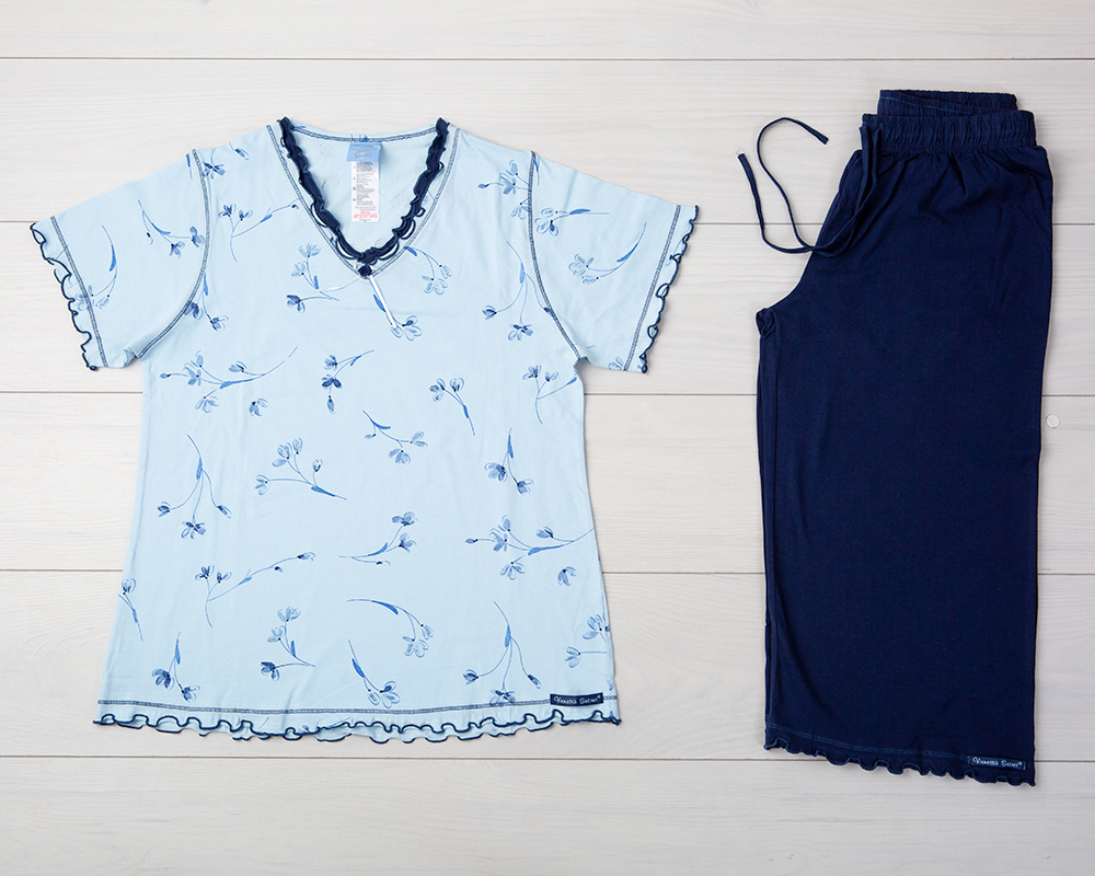 Легкая хлопковая пижама с бриджами Vienetta Secret VS 06. Футболка голубого цвета с цветочным принтом. По краям темно-синяя волнистая отделка. На V-образном вырезе атласный бантик. Темно-синие бриджи с удобным поясом. По нижнему краю бриджей также волнистая отделка.