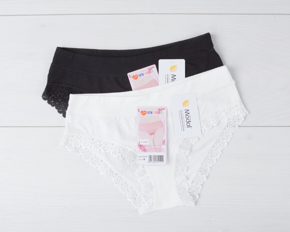 Белые однотонные женские трусики из серии DC Girl modal 21151. У модели гладкая достаточно широкая уплотненная резинка. Нижние края отделаны тесьмой кружева.