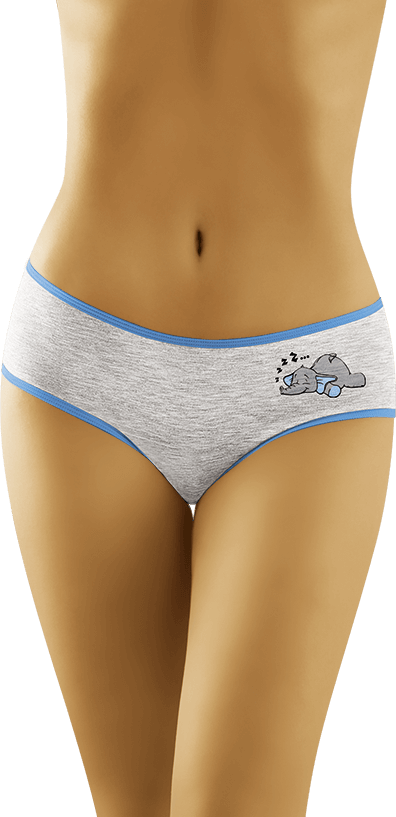 Женские трусы с рисунком слоника Wolbar FUNNY SLONIK 2501. Модель классической формы слип со средней посадкой. Выполнены из хлопка цвета меланж, по краям голубая отделка.